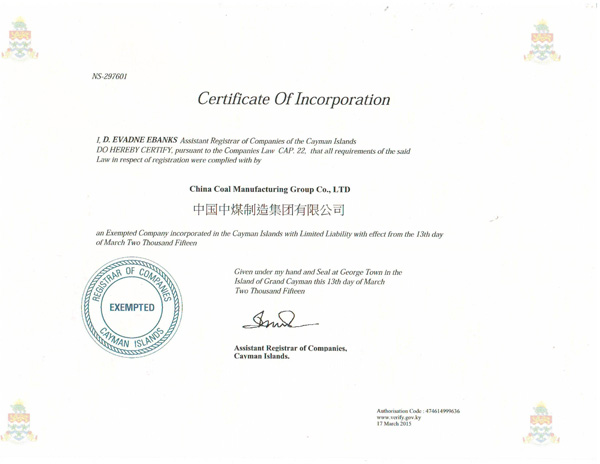 热烈祝贺中国中煤制造集团有限公司在英国开曼群岛成功注册